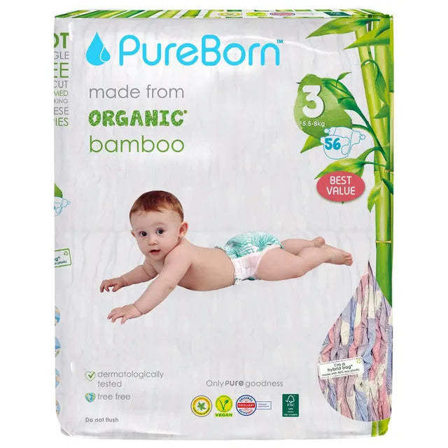 Our nappies are eco-friendly, made with organic bamboo pulp. They are free from harmful chemicals and intended for use by babies and toddlers up to 2 & 1/2 years of age. PureBorn Eco Organic Bamboo Baby Nappies are ultra-soft, with a cloth-like feel to provide maximum comfort for the babies. They are made with unbleached bamboo fibres in the core layer and soft non-woven fabric on both top and bottom layers to provide the best comfort and protection on the most sensitive skin.