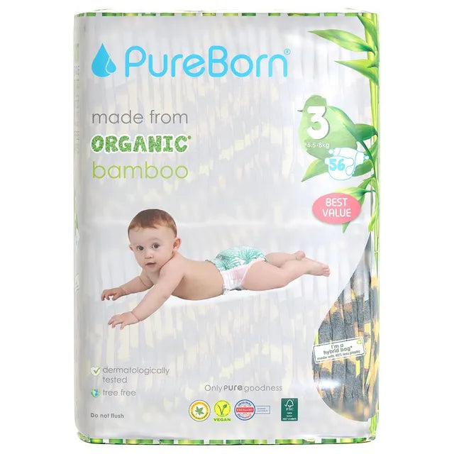 PureBorn Organic Bamboo Ultra Soft (5.5 - 8 kg) Nappies Size 3 Leopard Print - 56 Pcs