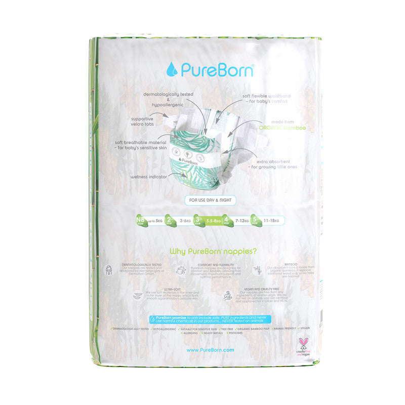 Our nappies are eco-friendly, made with organic bamboo pulp. They are free from harmful chemicals and intended for use by babies and toddlers up to 2 & 1/2 years of age. PureBorn Eco Organic Bamboo Baby Nappies are ultra-soft, with a cloth-like feel to provide maximum comfort for the babies. They are made with unbleached bamboo fibres in the core layer and soft non-woven fabric on both top and bottom layers to provide the best comfort and protection on the most sensitive skin.