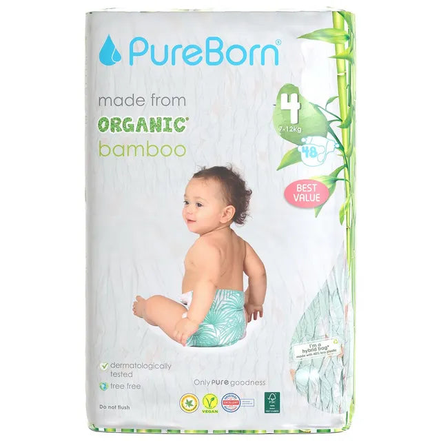 PureBorn Eco Organic Bamboo Baby Nappies are ultra-soft, with a cloth-like feel to provide maximum comfort for the babies. They are made with unbleached bamboo fibres in the core layer and soft non-woven fabric on both top and bottom layers to provide the best comfort and protection on the most sensitive skin. Nothing is more delicate than your babys bottom and protecting it requires products that are gentle and free of harsh chemicals. Experiencing nappy rash can be painful for babies, therefore it is wise to take preventative measures to ensure no harsh irritants are rubbing against your babys precious skin. PureBorn nappies are the perfect solution for painful nappy rashes. We have replaced much of the plastic materials you find in standard nappies, with sustainable materials that are not only kinder to your babys skin but also helps to protect the future resources of our world.