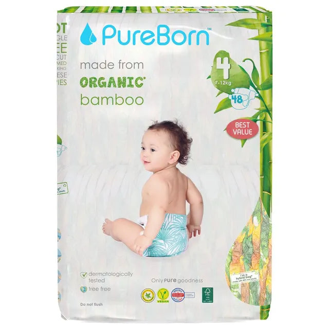 PureBorn Eco Organic Bamboo Baby Nappies are ultra-soft, with a cloth-like feel to provide maximum comfort for the babies. They are made with unbleached bamboo fibres in the core layer and soft non-woven fabric on both top and bottom layers to provide the best comfort and protection on the most sensitive skin. Nothing is more delicate than your babys bottom and protecting it requires products that are gentle and free of harsh chemicals. Experiencing nappy rash can be painful for babies, therefore it is wise to take preventative measures to ensure no harsh irritants are rubbing against your babys precious skin. PureBorn nappies are the perfect solution for painful nappy rashes. We have replaced much of the plastic materials you find in standard nappies, with sustainable materials that are not only kinder to your babys skin but also helps to protect the future resources of our world.
