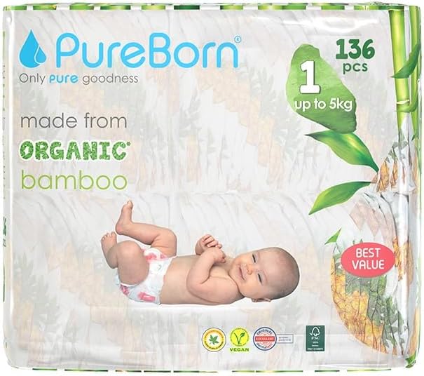 PureBorn Organic Bamboo Ultra Soft (Up To 5Kg) Nappies Size 1 Assorted Print - 136 Pcs
