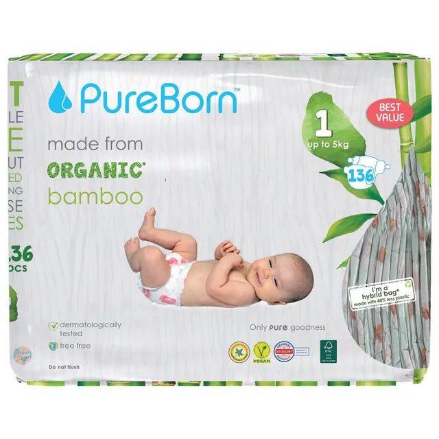 PureBorn Organic Bamboo Ultra Soft (Up To 5Kg) Nappies Size 1 Daisy Print - 136 Pcs
