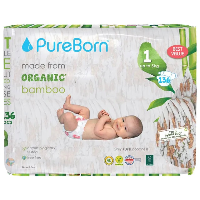 Nothing is more delicate than your baby's bottom and protecting it requires products that are gentle and free of harsh chemicals. Experiencing nappy rash can be painful for babies, therefore it is wise to take preventative measures to ensure no harsh irritants are rubbing against your baby's precious skin. PureBorn nappies are the perfect solution for painful nappy rashes. We have replaced much of the plastic materials you find in standard nappies, with sustainable materials that are not only kinder to your baby's skin but also helps to protect the future resources of our world.