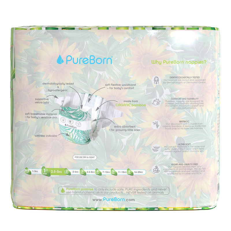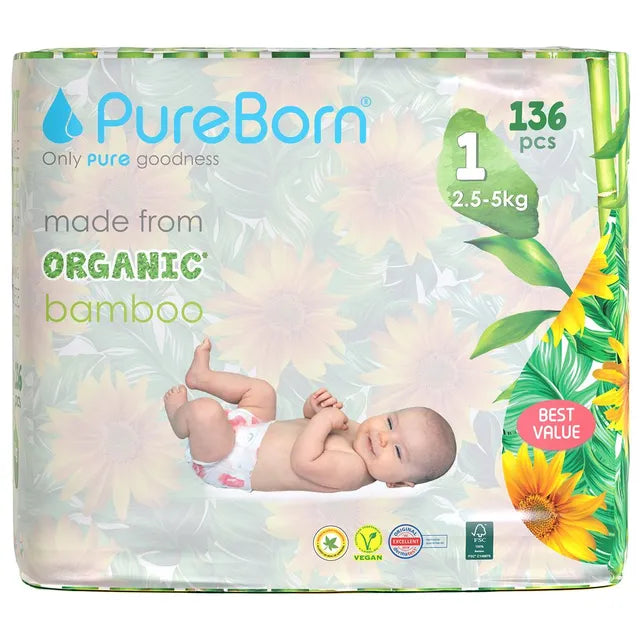 PureBorn Organic Bamboo Ultra Soft (Up To 5Kg) Nappies Size 1 Sunflower Print - 136 Pcs