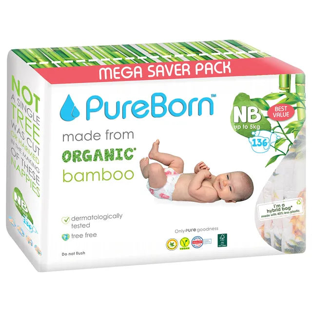 PureBorn use degradable plastics and 100 % pure Organics Bamboo Pulp which is not bleached with chlorine. A specialized Top sheet is used for the super soft feeling and instant dryness. Not a single tree has been cut to make this diaper. , , Children's skin is up to 70% more absorbent so we have derived natural gentle natural formulations, using only safe preservatives. , , We use sustainable bamboo, as it is a sustainable resource for the fibre and pulp on nappies (patented) and add our gentle formulation to bamboo fibre wipes. , , Why Bamboo:, Bamboo is a Grass not Tree. It doesn't need a pesticide and lots of water to grow. Certain species of Bamboo Can grow 50 cm a day, unlike trees, it doesn't need a re-plantation a day. Possibly can have 3 crop cycle a year. Bamboo Fiber itself is anti- bacterial, produces 35% more Oxygen than an equivalent stands of Trees. Thermostatic Nature of Bamboo fibers controls temperature & renders cooling effect.