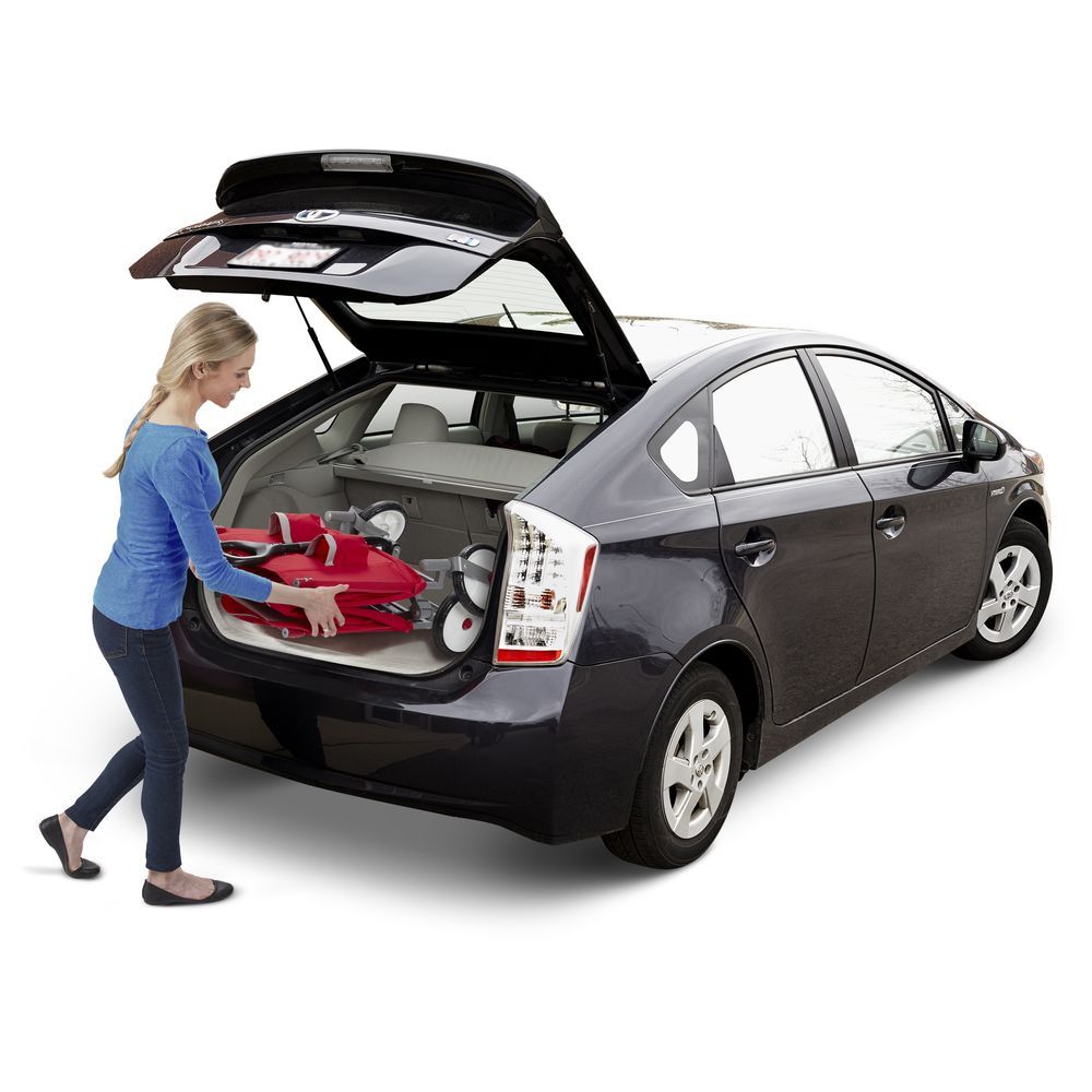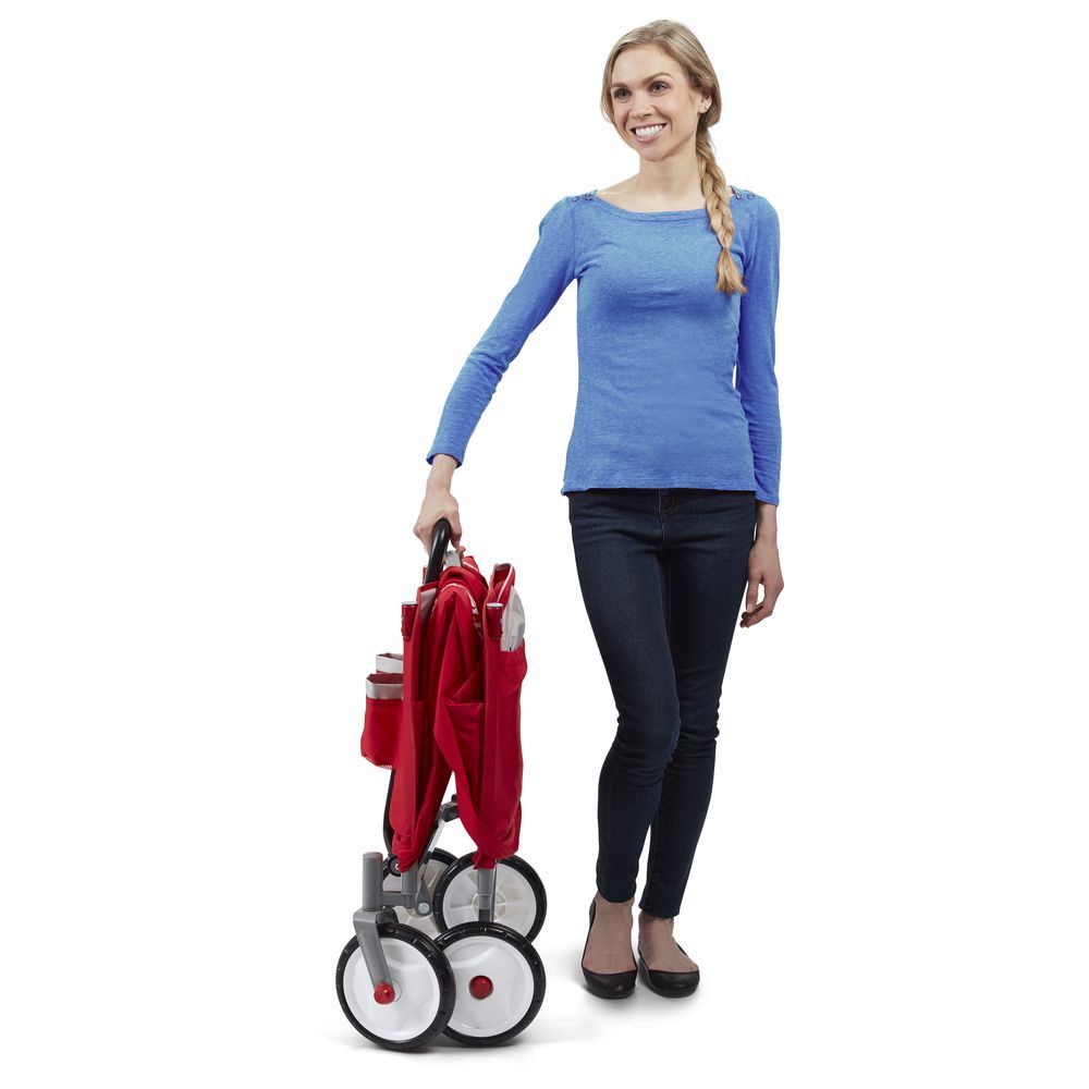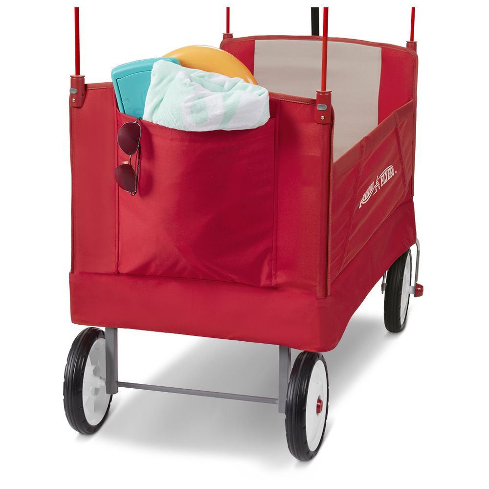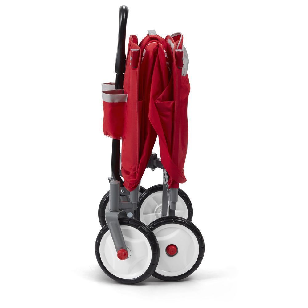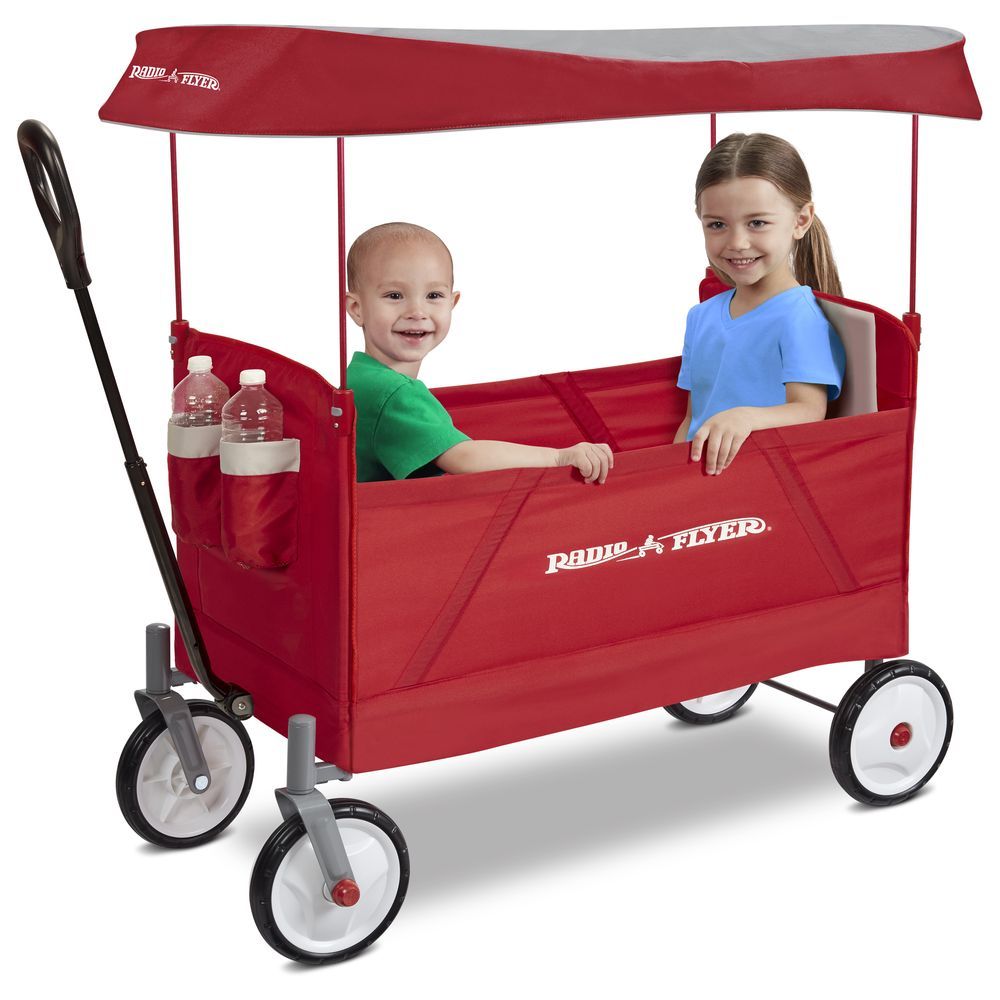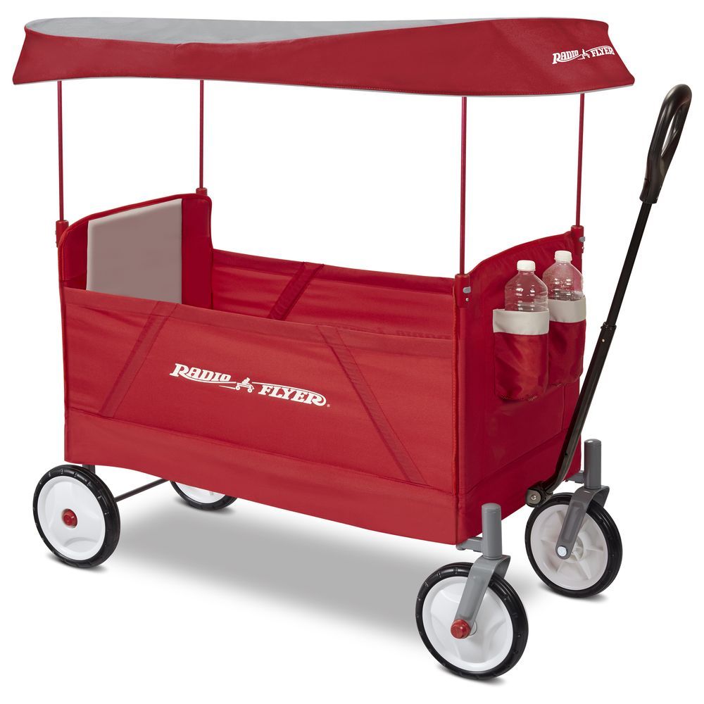Radio Flyer's EZ Fold Wagon With Canopy is designed as a full sized wagon that folds compacty. With an easy one hand fold, you can take or store the wagon anywhere! The high seat backs and thick padded seats provide a comfortable ride, and the UV blocking canopy stores on the wagon and protects from the sun. The DuraClean fabric is durable and can be easily wiped clean. The wagon also features seatbelts for safety, 2 cup holders on the front, and a magnet to hold the handle upright when it is not being used.
