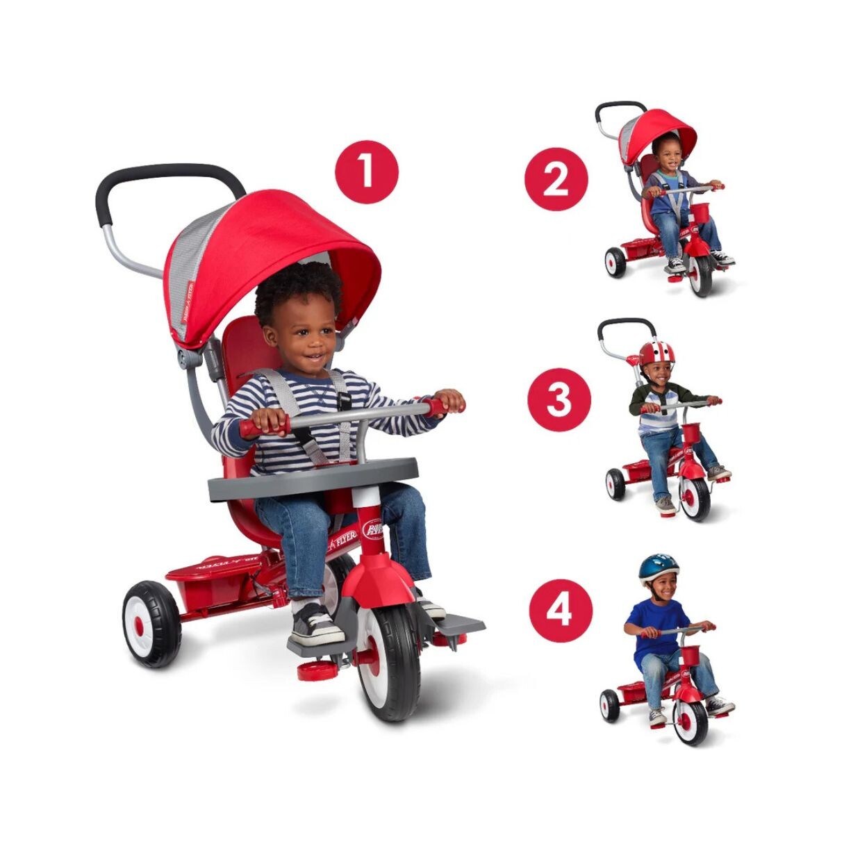 AGES 1 YEAR TO 5 YEARS: The 4 stages include toddler trike (12 mos. – 18 mos.), steering trike (18 mos. – 24 mos.), learn-to-ride trike (2 – 3 yrs.), and classic trike (4 – 5 yrs.).