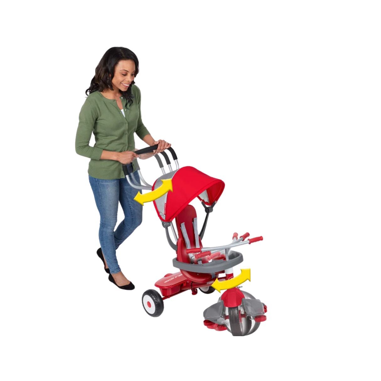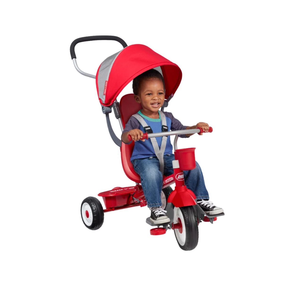 The 4-in-1 stroll ‘N trike is the ultimate grow-with-me trike that offers 4 ways to ride. It easily converts from an Infant trike to a steering trike, learn-to-ride-trike, and finally a classic trike. The trike features removable wrap around tray with cup holder, Adjustable UV blocking canopy, and a 3-point harness for safety. It also has wide rear wheels to provide a quiet ride, removable footrest for early stages, and an XL rear storage bucket. The parent steering push handle removes for older riders. The sturdy steel frame and adjustable seat ensure it will last for years. For ages 9mo - 5yr. Adult Assembly Required, Tools Not Provided.