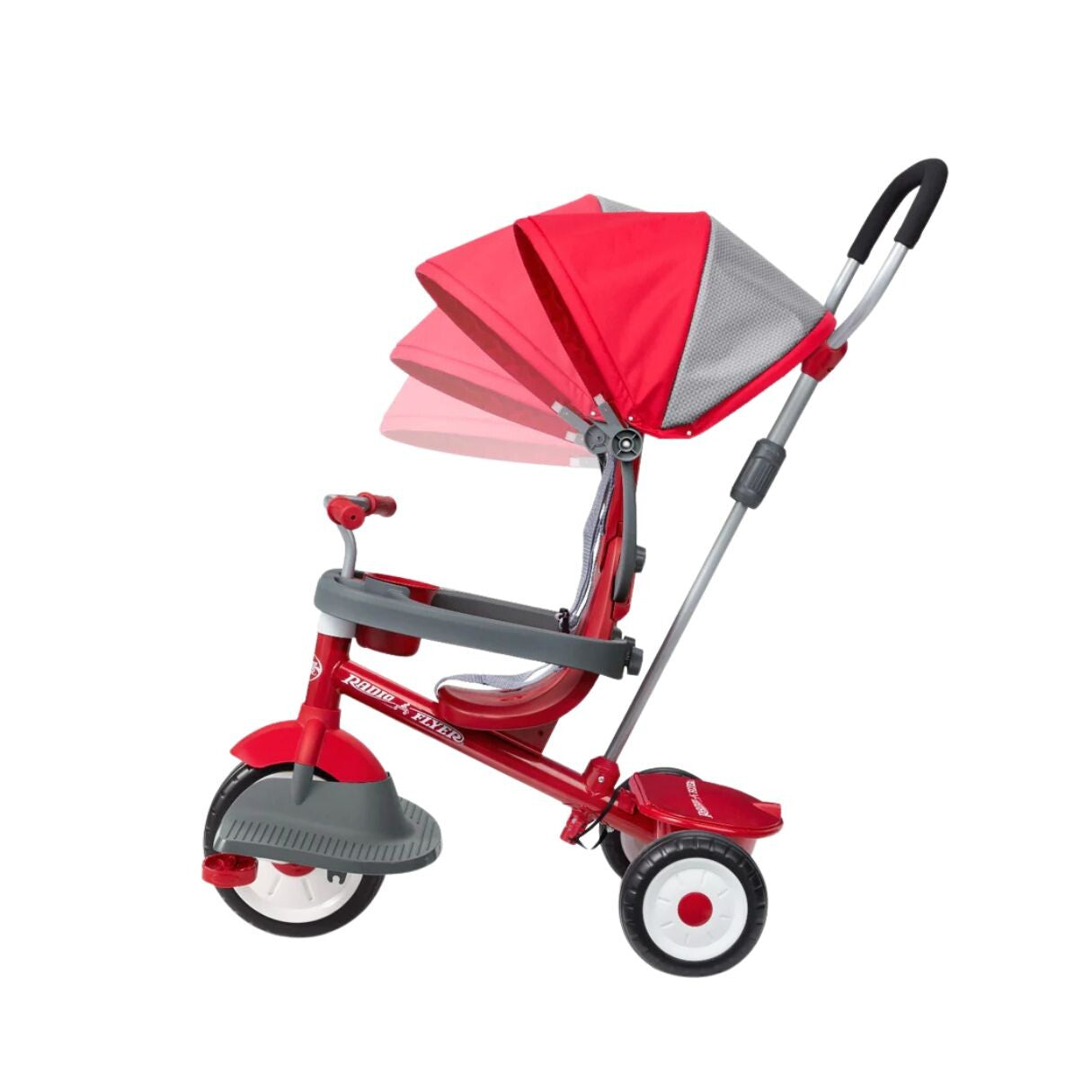 - REMOVABLE ACCESSORIES: The removable accessories allow this tricycle to grow with your child. The accessories include an adjustable UV protection canopy, wrap around tray, headrest and seat belt, foot rest, and parent push handle.