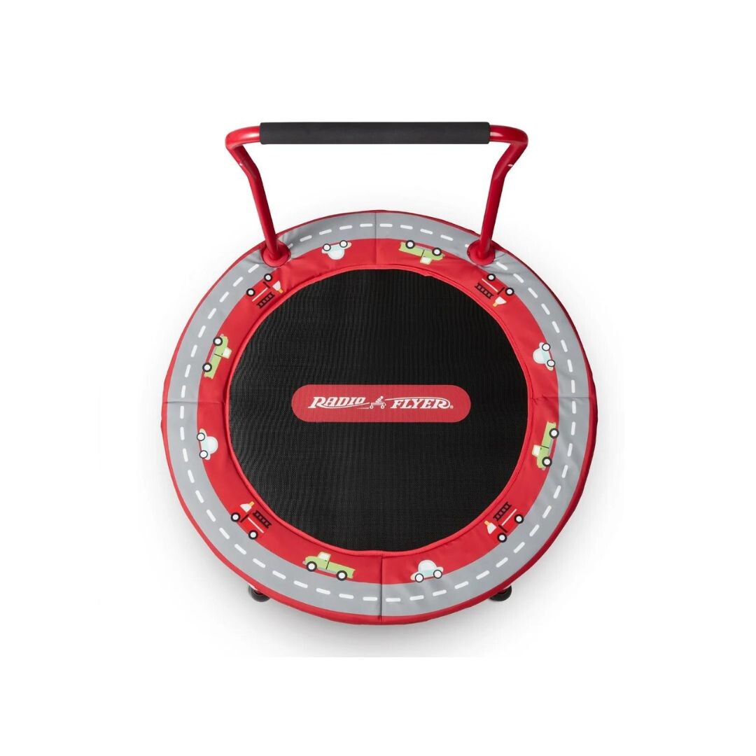2 toys in 1! Use as a fun indoor trampoline to expend energy. Then, when your child is ready for a different way to play, the bounce surface doubles as play mat with fun racetrack theme. Bring out other toys to play with in playmat mode to keep the fun going. The sturdy handle has a soft, comfort grip and folds flat making for convenient storage, even in tight spaces.