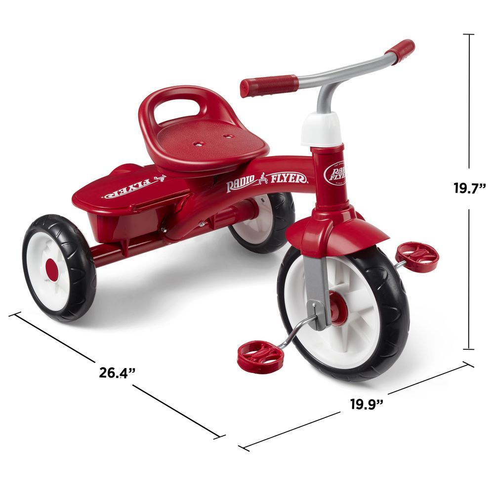 This tricycle is great for beginner riders It offers convenience, comfort, and fun! The quiet ride tires provide a smooth ride. The Red Rider Trike has a covered storage bin so kids can bring their favorite treasures along for every ride, or find new treasures on their adventure. With an adult hand grip on the seat back, the Red Rider Trike can easily be transported. The adjustable seat allows this tricycle to grow with your toddler from ages 2 & half to 5 years.