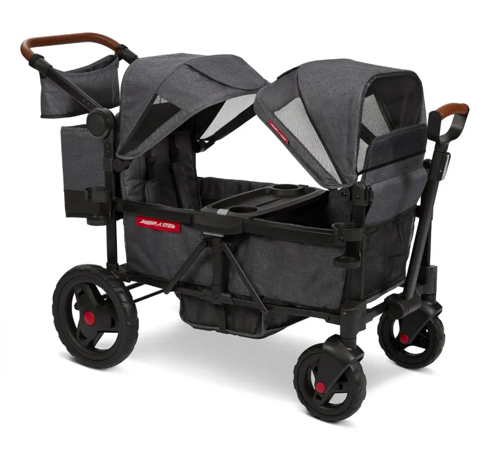 - DUAL CANOPIES: This stroller wagon includes two UV protection canopies to protect your little ones from the sun. The canopies also have peek-a-boo windows, mesh sides and store on the wagon when not in use.