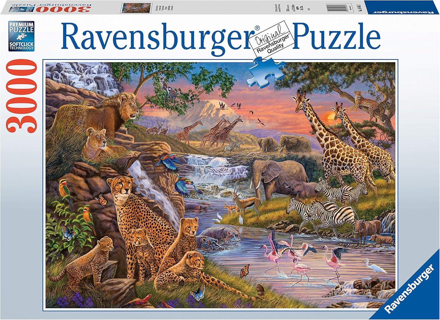 Take a journey through the wild with the Ravensburger Animal Kingdom 3000?piece puzzle—SKU 16465?3. This expansive collage brings together lions, elephants, giraffes, magnificent birds and exotic flora in a tapestry of bright tribal color and detailed design. The finished puzzle measures approximately 121 × 80 cm (48 × 32 in), creating a bold display that showcases the beauty of our planet’s wildlife. Each piece is precision-cut with Ravensburger’s SoftClick technology and printed on thick linen-structured board for a premium matte finish that minimizes glare and preserves vivid color. The unique shapes and defined zones—such as dense foliage, patterned pelts or sky gradients—help simplify sorting and guide prolonged build sessions. Designed for ages 14 and up, this advanced-level puzzle challenges visual memory, dexterity and focus in an immersive nature-themed project. Built from extra-thick cardboard to resist bending and fading, it’s crafted to be assembled and enjoyed again and again. Manufactured using FSC Mix 70 % certified materials and printed with eco-conscious inks, Animal Kingdom reflects Ravensburger’s commitment to quality and sustainability. Elegantly packaged, this puzzle makes a striking gift or personal keepsake. Whether you’re a wildlife enthusiast, puzzle collector or nature lover, the Animal Kingdom puzzle provides an unforgettable screen-free journey piece by piece.