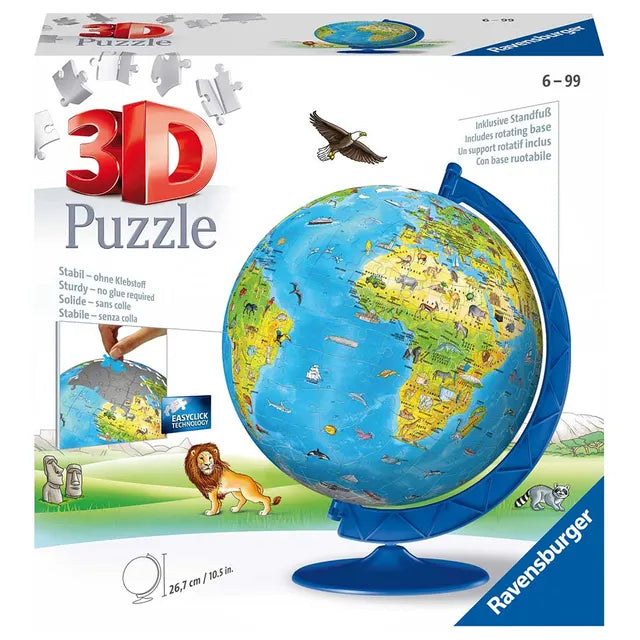 Step into the world of Ravensburger, a brand synonymous with over 130 years of quality craftsmanship. We bring to you the Children's World Globe 3D Jigsaw Puzzle, a fusion of fun, learning, and artistry. This 180-piece puzzle, perfect for both kids and adults, offers an immersive experience with our Easy Click Technology. Each piece is precision-made to ensure a perfect fit, signified by a satisfying 'click'. Once assembled, this puzzle transforms into a 3D globe, ready to be displayed as a testament to your accomplishment and a reflection of world geography. Our commitment to quality ensures a frustration-free, enjoyable, and rewarding puzzle-building journey. Trust Ravensburger to transform your leisure time into an experience of hand, head, and heart.