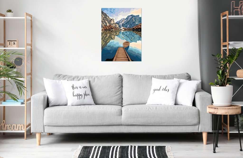 - Capture tranquil beauty with the Lake View kit: a serene canvas print of a still mountain lake and forest landscape set on high-quality cotton canvas sized 30×40 cm for uplifting creative artistry