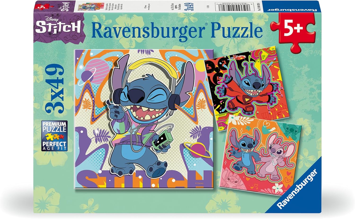 - Includes three vibrant 49-piece puzzles featuring Stitch and Angel in playful scenes dancing, exploring and having fun—each puzzle back is uniquely coloured for easy piece sorting and replay value