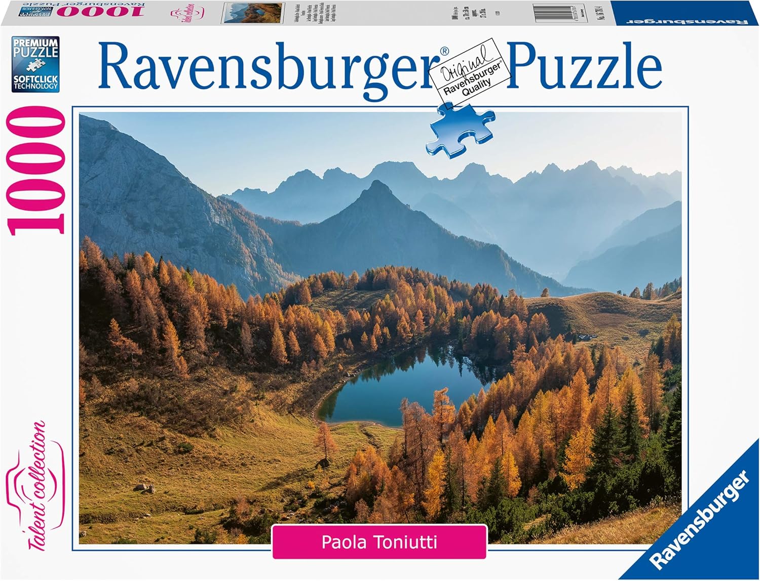 Ravensburger Friaul?Julisch Venetien (Talent Collection, SKU 16781?4) invites you to enjoy a tranquil alpine moment with this 1000?piece puzzle. When complete, the image spans 70×50 cm and depicts a serene mountain lake set in Italy’s Friuli?Julisch Venetien region surrounded by dramatic peaks and lush foliage, reflecting nature’s peaceful grandeur. Produced in Germany using Ravensburger’s renowned Soft?Click precision-cutting, each extra-thick cardboard piece is printed on linen-textured, glare-reducing paper for vivid visuals and satisfying tactile feel. Suitable for ages 14 +, this landscape offers both soothing and rewarding assembly experience as contrasting zones—from sky to water to wooded hills—grow into a cohesive alpine vista. This elegant puzzle doubles as serene artwork upon completion and is well?suited for framing or display. Crafted with FSC?certified materials and non-toxic inks, Friaul?Julisch Venetien offers a premium, eco-conscious puzzling experience that blends craftsmanship, calm and artistic beauty.