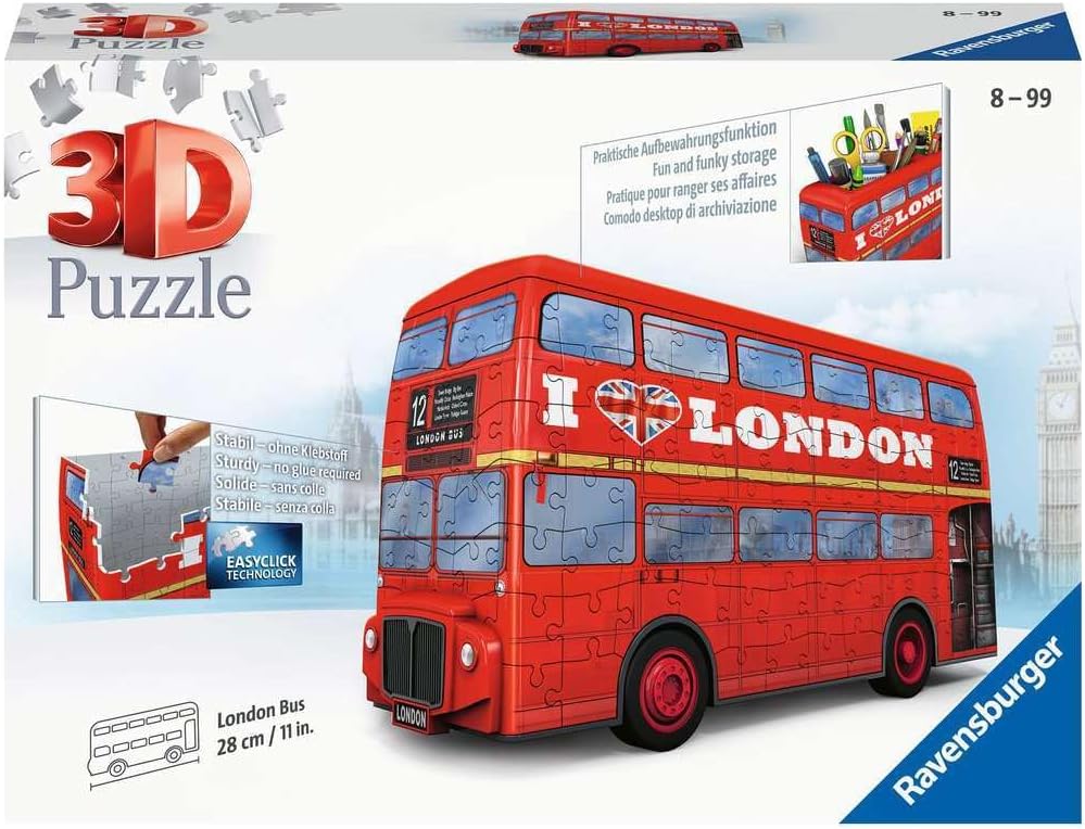 - Double your fun with our iconic “London Bus” 3D puzzle that’s also a pencil holder — very collectible with these heritage buses no longer in service!