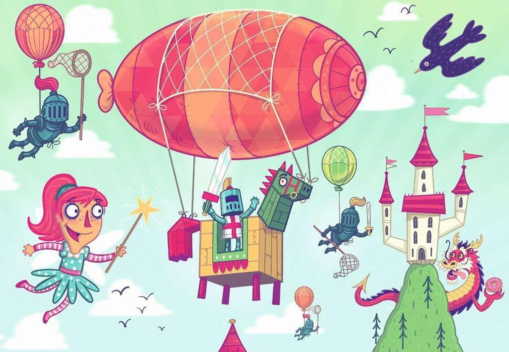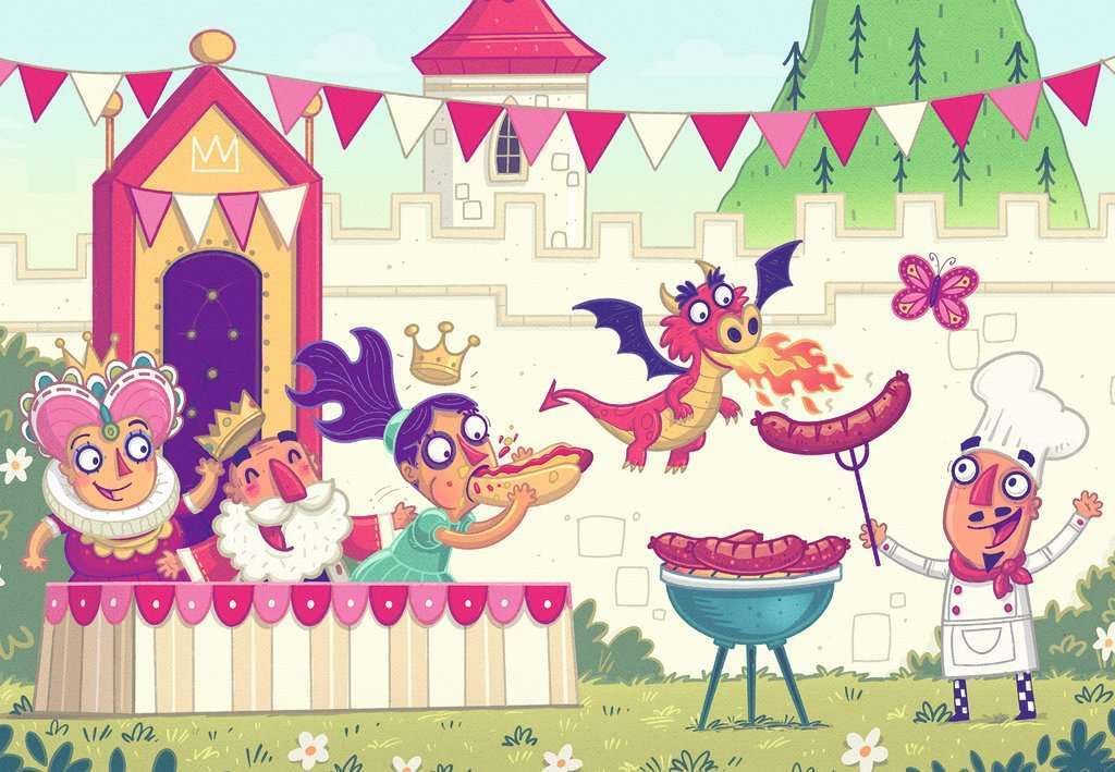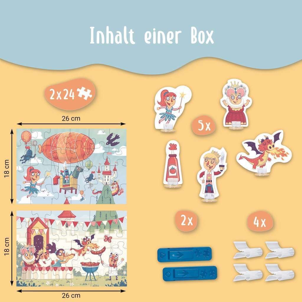 Celebrate Princess Elisa’s birthday with a cookout and air show at Dragonstone Castle! The Queen makes sure there are plenty of hot dogs with lots of ketchup (Elisa’s favorite food). Smokey the Dragon helps grill them fast with a puff of fire. Prince Peter stands guard and Flora the Fairy is ready to help the high-flying knights! Join the fun — just build the puzzles inside the two parts of the box, put them together with the included clips, and get ready for a fun feast at the “Royal BBQ”!