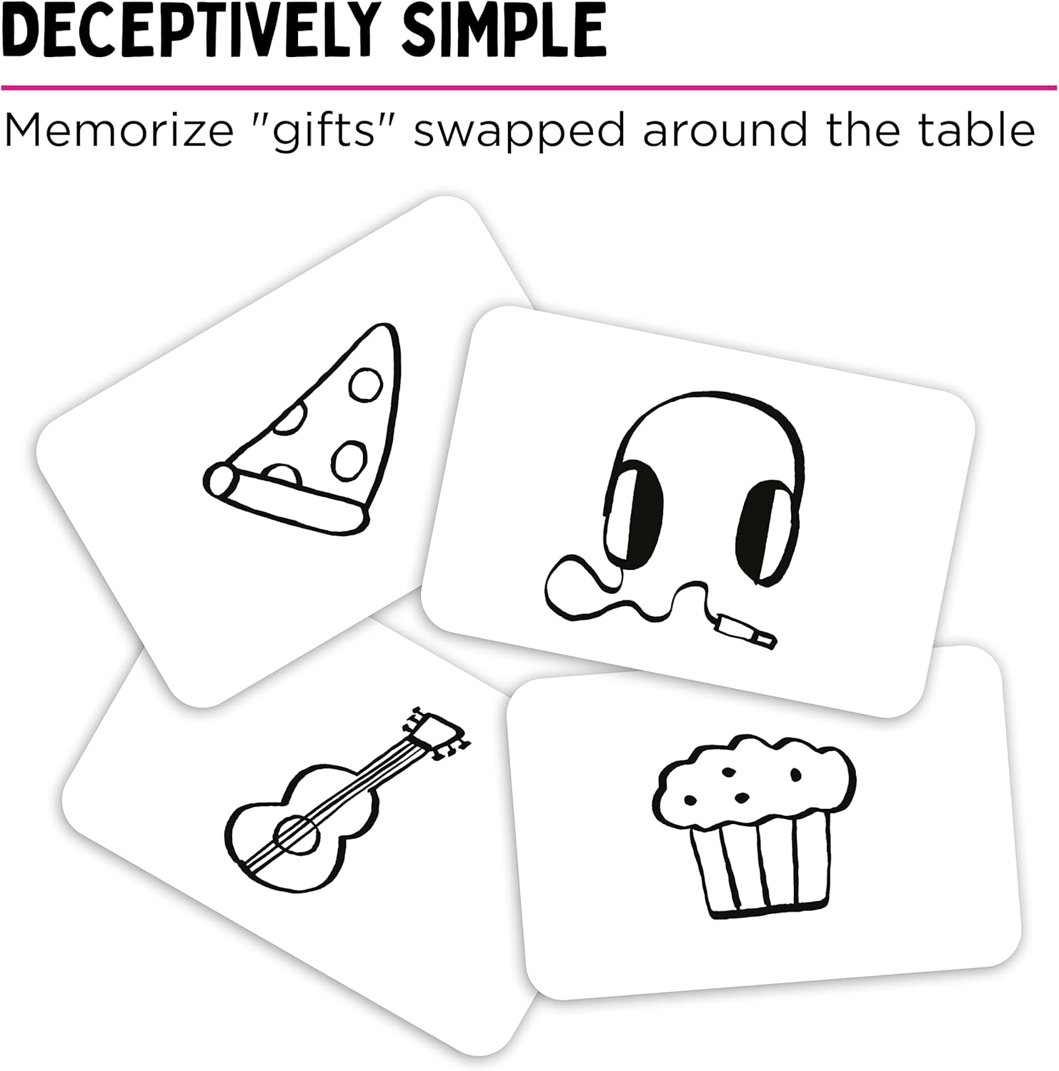 Wrap and regift objects in this deceptively simple card game of having the world’s best memory... or convincing everyone you do! Was that gift a hat, a bucket, or a traffic cone?! Play this “unforgettable” bluffing game with friends and family for fun, laughter, and a dash of madcap mayhem. As cards or gifts are flipped facedown and passed around the table, players must memorize the object on each card or bluff their confidence as they pass the unwanted gift to someone else. Avoid getting caught declaring the wrong object or gain penalty points. The player with the least points at the end wins!