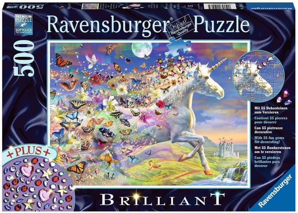 - Spark magical creativity with this Brilliant series 500?piece puzzle featuring a unicorn surrounded by fluttering butterflies and vivid fantasy color—the perfect mix of challenge and imagination.