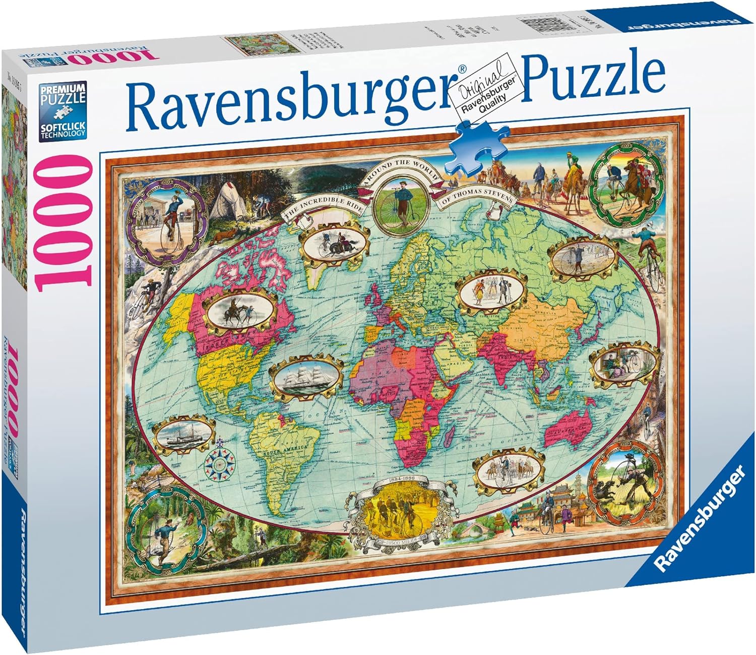 Embark on a journey with Ravensburger's 'Bicycle Ride Around The World' 1000 piece jigsaw puzzle. This meticulously designed puzzle captures the daring route Thomas Stevens took as he cycled around the globe. Our unique Softclick technology ensures every piece fits perfectly together, creating a satisfying and seamless puzzle experience. Made from durable, long-lasting materials certified by The Forest Stewardship Council, our puzzles are crafted for years of enjoyment. The vibrant, richly detailed images are printed on matte-finish, glare-free pieces, offering a premium puzzling experience that is both engaging and educational. Ravensburger is the bestselling puzzle brand worldwide, with over 1 billion puzzles sold. Our puzzles are the perfect gift, fostering memorable moments and endless hours of fun. Challenge your problem-solving skills and enhance your patience with this intricate floor puzzle. Ideal for puzzle enthusiasts of all ages.