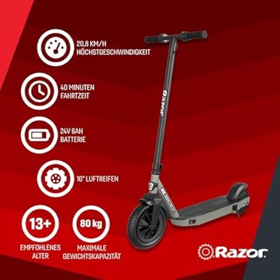 - Product Weight:37.32pounds Color:Gray Product Name:E200 HD Electric Scooter w/ 13 mph Max Speed Brand:Razor Model Number:13112190 Maximum Weight Capacity:175 pounds Assembly Required:Partial Recommended Minimum Age:12years Number Of Wheels:2