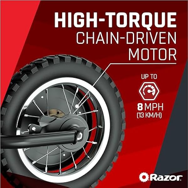 The Mx125 Is Razors Smallest Electric Dirt Bike, Scaled Down To Size For Riders Ages 7 And Up.,Designed with motocross dirt bike geometry, knobby tires and twist-grip throttle.,Rear-wheel drive delivers better balance control and traction for a safer, more stable ride.,,Carries riders at speeds of up to 8 mph (13 km/h) with up to 40 minutes of continuous use.