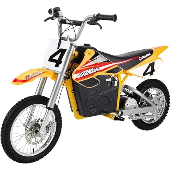 Made to hit dirt hard and fast, this supercross-inspired Razor MX650 is a high performance motocross bike that runs on electricity — no gas means you’ll go green while you go fast. The adjustable riser handlebars ensure a customized fit, and hand operated front and rear disc brakes and twist-grip acceleration control put the driver in command. he Razor Dirt Rocket MX 650 is suitable for children ages 16 and up and has a maximum weight capacity of 220 lbs.
