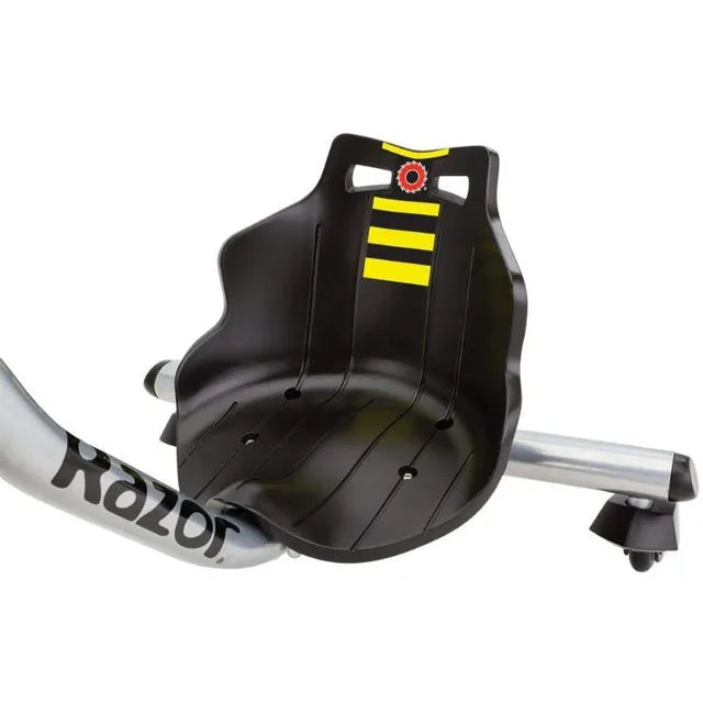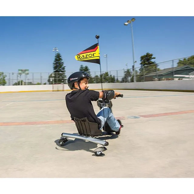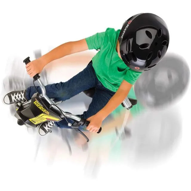 Blast into the future with the PowerRider 360 – the all-new, electric powered three-wheeler from Razor! With the push of a button, you’re off – no pedaling required. Race at speeds up to 13 km/h, cut full 360 degree spins, slide, even drift on PowerRider 360’s high-performance dual inclined rear caster wheels. It’s a 360 ride electrified!