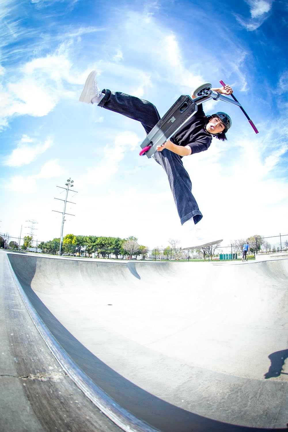 Pro XXX keeps the fast rolling 110 mm wheels, but sees several upgrades from the XX model to meet the expectations of more advanced riders. The larger deck allows more foot room for extreme tricks, and the handle bar, the main touchpoint in terms of control, is wider to accommodate larger riders or those that would prefer to cut their bars to an exact width.