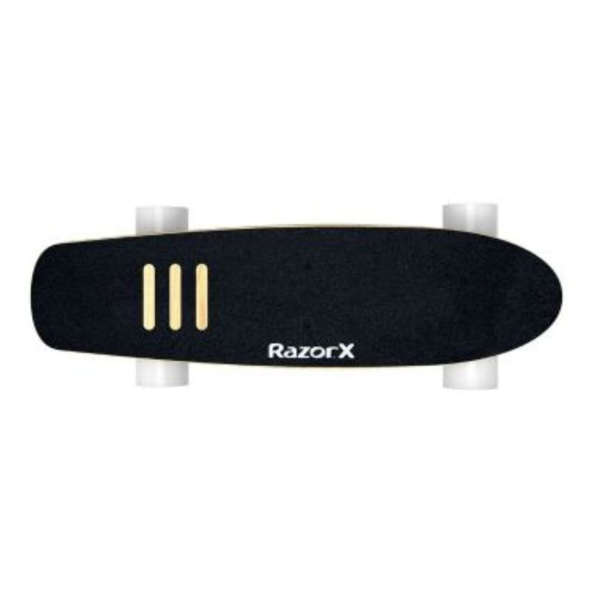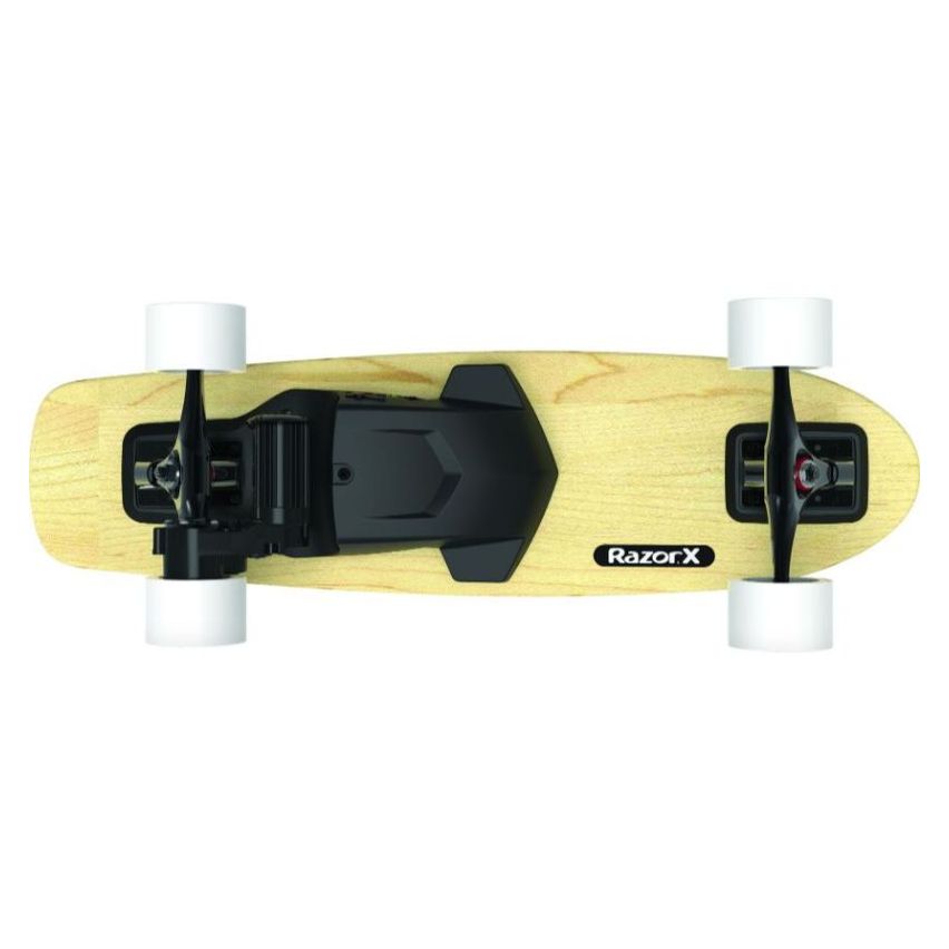 Put fun on cruise with the lithium-ion-powered electric skateboard made to zoom! The RazorX Cruiser is a skateboard with an electrifying kick, putting the control of a 125-watt, geared motor in the palm of your hand and under your feet. This complete cruiser uses an innovative, geared, rear-wheel-drive motor and lithium-ion battery to deliver electrifying skate action at speeds up to 10 mph (16 km/h) for up to 40 minutes of continuous use. Hit your perfect cruising velocity with the variable-speed control on the wireless, digital, hand-held remote, then lean into the lithium-ion-powered, carve-and-turn action. The 29.7-inch (754 mm) long, 5-ply maple deck and custom, reverse kingpin trucks deliver a smooth, responsive ride, while perforated grip tape and ground-gripping urethane wheels keep you firmly in control of your board. Our kick-to-start, geared, rear-wheel-drive motor technology is virtually maintenance free, meaning you won't have to worry about alignment issues, chain or belt.