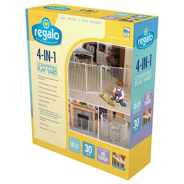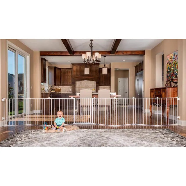 Providing a versatile way to keep your child safe, the Regalo Super Wide Baby Gate and Play Yard offers numerous convenient configurations for around the house. It can be used as a standalone play yard or a gate and is ideal for large, angled, or uneven openings., It is ideal as a play yard, fireplace barrier, at the landing of stairs, or a super gate for very wide openings.