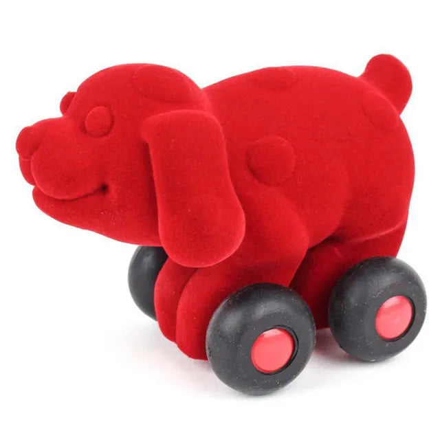 The Rubbabu Aniwheeles Dog is a palm sized dog toy on wheels. In bright colours and squishy-soft material, this toy is appealing and fun for babies, toddlers and for anyone. The push and pull movement of the toy makes it to roll well on any surface. Also, this toy is covered with an easy-to-clean nylon material. This toy is handmade, eco-friendly and child-safe.
