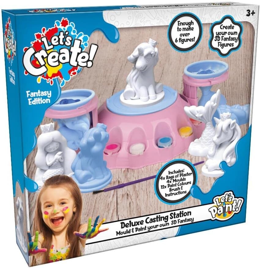What's Included This Let's Create Fantasy Casting Station will keep your child entertained for hours. The kit includes bags of plaster, 4 molds, 12 paints, paint brushes and pouring station, so there's everything your little artist needs to get started.