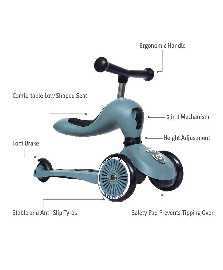 The Scoot&Ride 2-in-1 Highwaykick 1 & Helmet S-M Steel Bundle is a high-quality set designed to provide safety, comfort, and fun for your child. This bundle includes the Highwaykick 1 scooter, which transitions from a balance bike to a scooter as your child grows, and the Steel-colored helmet for optimal protection. Suitable for children aged 1 to 5, this bundle promotes balance and coordination, while ensuring safety with its adjustable, snug-fitting helmet.