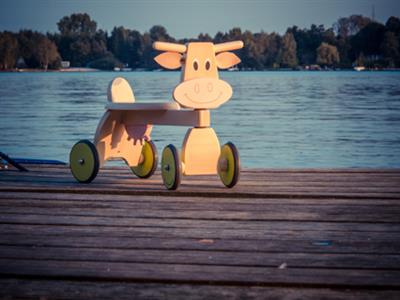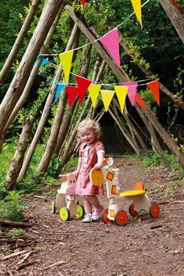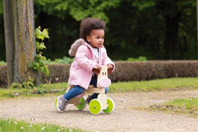 This tough four-wheel walker Cow by Scratch was designed in Belgium. The bike is made out of high quality beech and has extremely quiet rubber tyres that leave no marks on the floor. The bike is very stable and has a limited steering angle. The handles are ergonomic so they are easy for little hands to take hold of. The wooden support at the back of the saddle will make sure children don’t slide off. Little ones will feel safe and have oodles of fun going on their first cycling adventures!