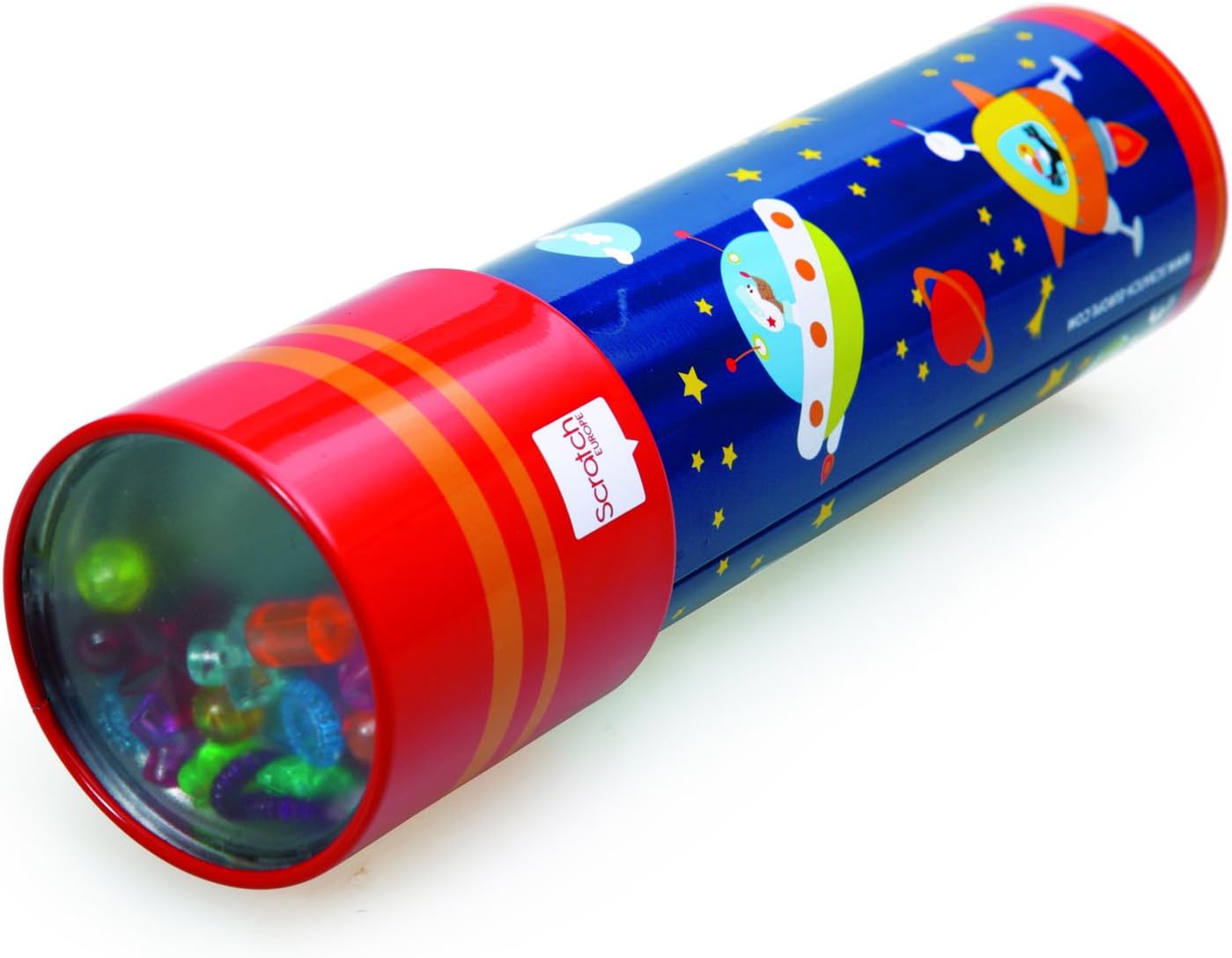 Such beautiful shapes and colours! It is hard to believe your eyes when you’re looking in this wonderful kaleidoscope. Imagine being a true spaceman and take a trip through the universe. Before you realize it, you’ll be lost in dreams and floating between planets and comets. Thanks to the rotating head you can even change colours and shapes. Fun design with illustrations of spacecrafts, built for explorers from 3 years and older.