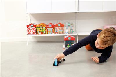 Eeeoooeeeoo, the ambulance drives up to the hospital.The injured person is brought in on a stretcher.Attach the stretcher to the ambulance using the magnet.At the hospital, he or she is immediately hooked up to the monitor and taken care of.You can turn the box into a playhouse, which is handy for tucking your toys away nicely when you're done.The box is made of sturdy cardboard, and the three wooden figures, the ambulance, the stretcher (magnetic) and the monitor are included.