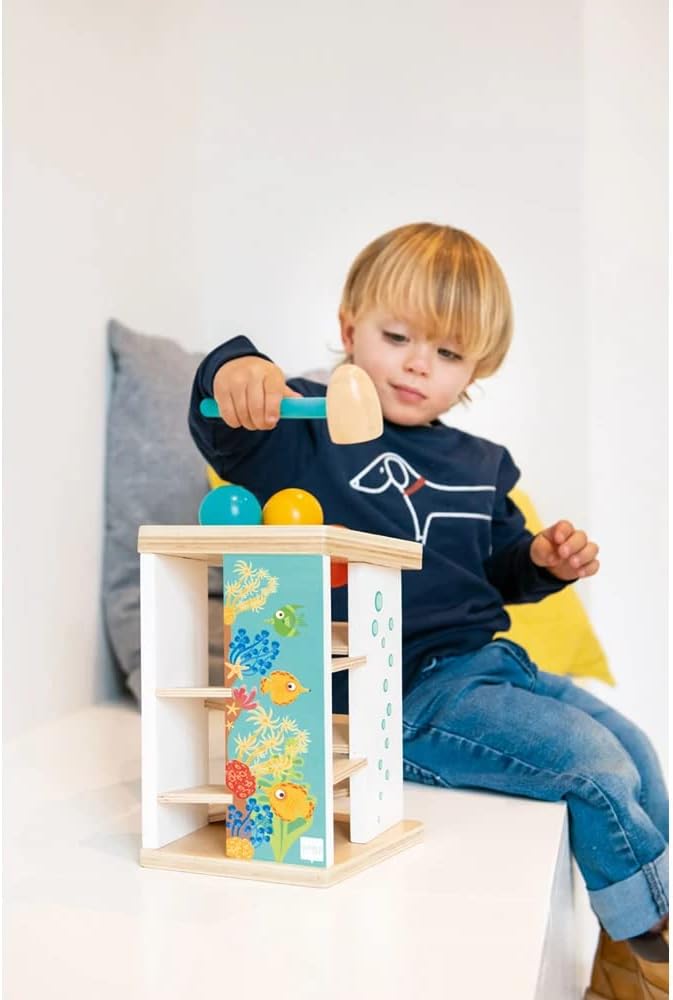 Toc toc! Knock the coloured balls with the hammer and listen to the little bell ring! This colourful underwater world helps children to react faster while having lots of fun! Put the 4 brightly coloured balls on the right opening. Now knock the balls through the holes with the little wooden hammer and fun galore! This game helps children to grow familiar with different colours. Made out of wood.