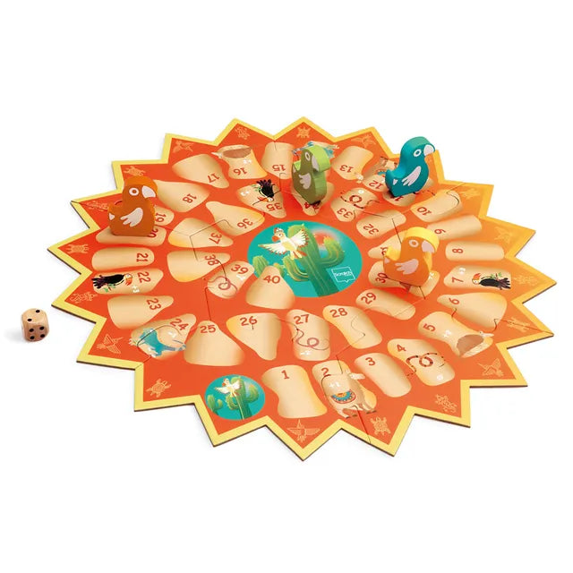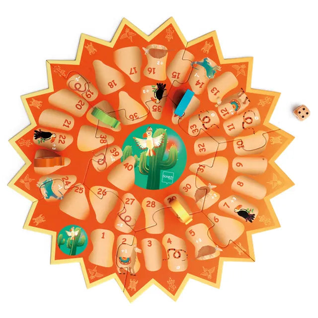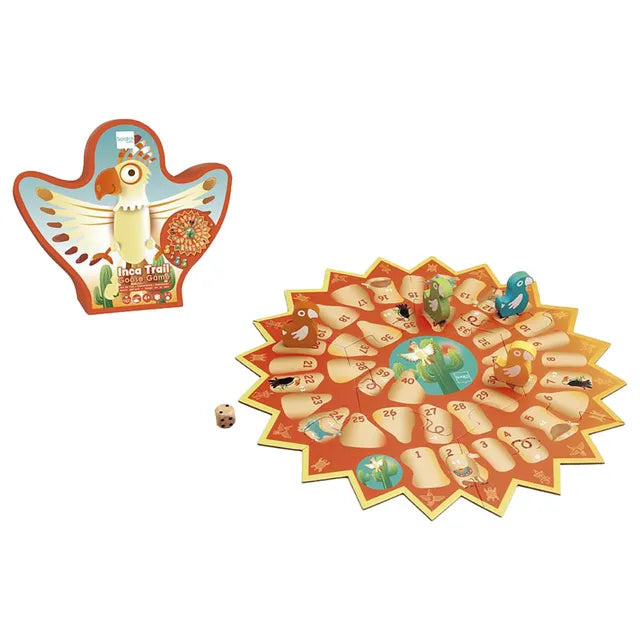 Game of the Goose, the ultimate classic family game, now in a fun Scratch version. Throw the die to advance your game piece along the Inca trail. The first to overcome all the obstacles and arrive in the centre wins! The perfect game for countless family moments, at home or on holiday., Contents: game board (consisting of 7 puzzle pieces), 4 game pieces, die. Players: 2 to 4., Preparation: each player chooses a piece. Place all the pieces on the space with the bird of paradise to start.