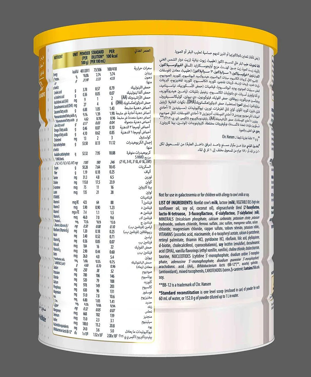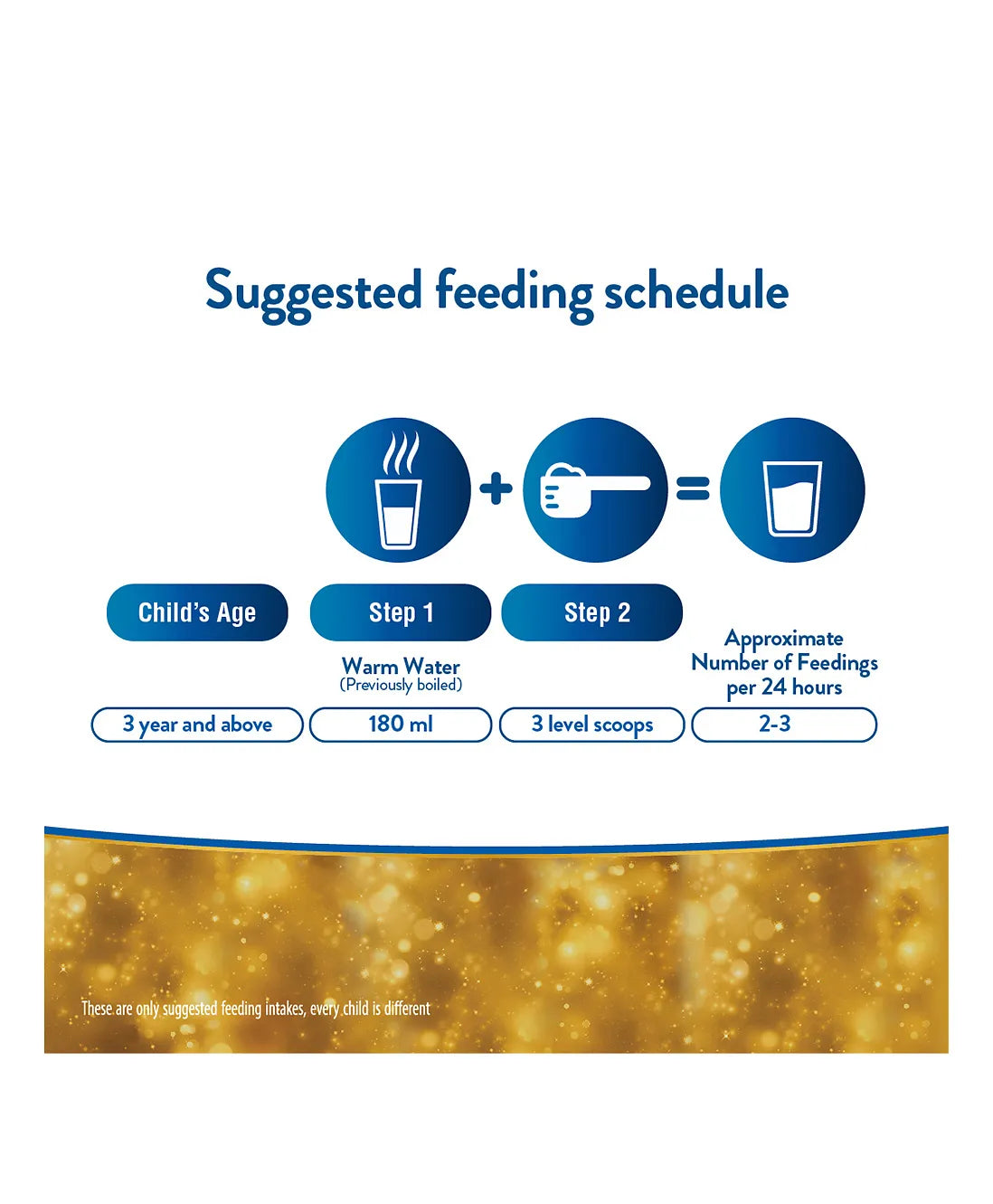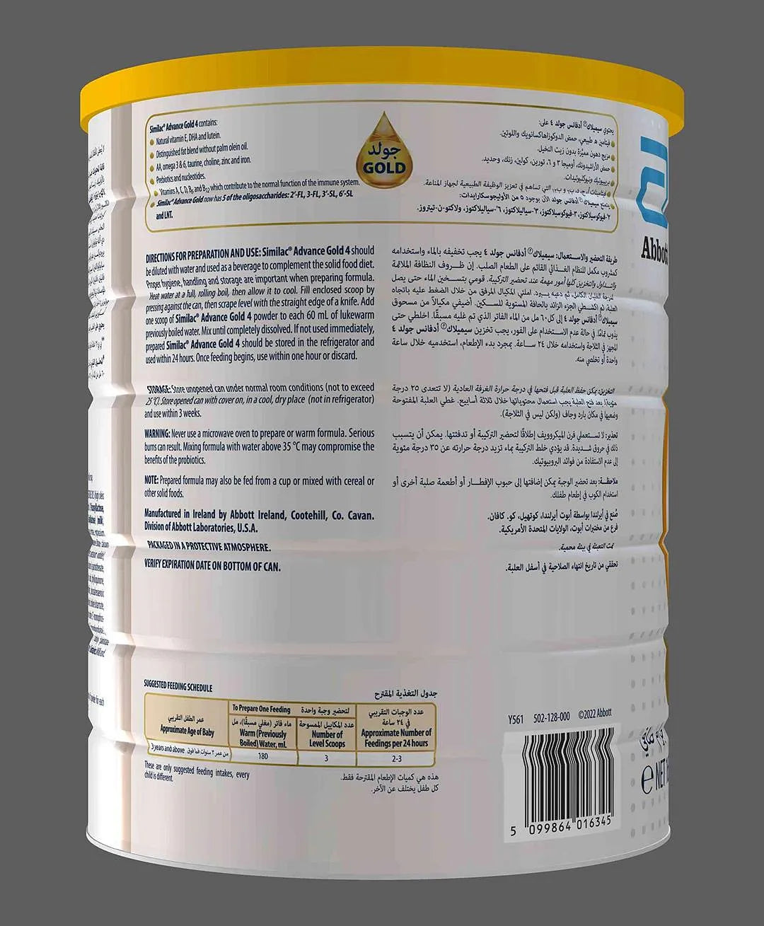 Similac advance gold is designed for children 3 years and above. it contains: hmo (2'-fl). hmos are the third abundant solid component in human milk. Aa, omega 3 & 6, taurine, choline, zinc and iron. prebiotics, probiotics and nucleotides. vitamin a, c, d, b6 and b12 which contribute to the normal function of the immune system. Should be diluted with water and used as beverage to complement the solid food diet Store unopened can under normal room condition (not to exceed 25 degrees Celsius. store opened can with cover on, in a cool dry place(mot in refrigerator)and use within three weeks.