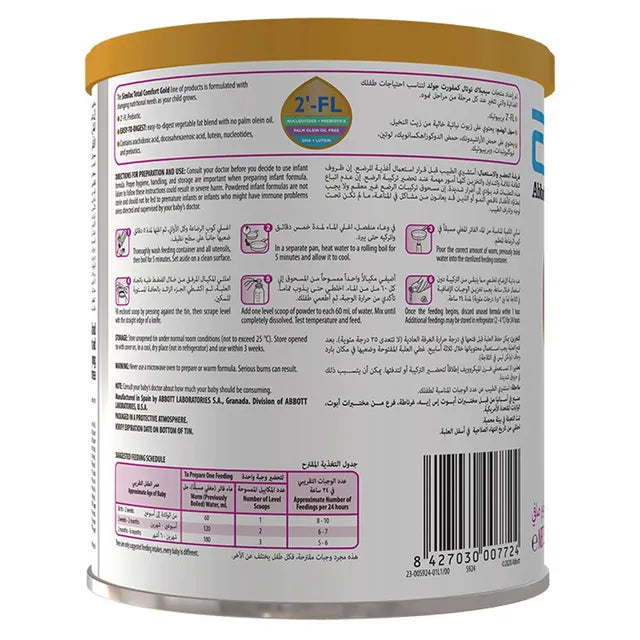 Formulated with changing nutritional needs in mind as your infant grows providing special care and comfort as it is specially formulated to be gentle on tiny tummies. , , Instruction: , Proper hygiene, handling, and storage are important when preparing infant formula. Failure to follow these instructions could result in severe harm. Powdered infant formulas are not sterile and should not be fed to premature infants or infants who might have immune problems unless directed and supervised by your baby's doctor. Use water that has previously been heated at a full rolling boil for 5 minutes. Allow the water to cool and follow mixing instructions carefully. Use only the scoop enclosed in this tin to measure Similac Total Comfort 1. If you prepare more than one feeding, it must be refrigerated at 2 -4 ?? C and used within 24 hours. Once feeding begins, use within one hour or discard.