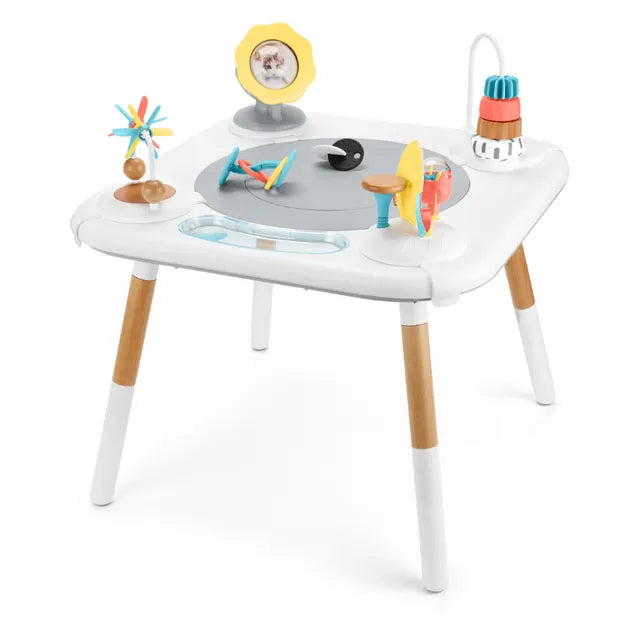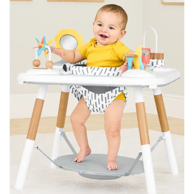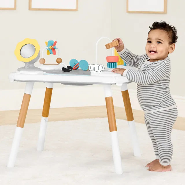 Designed in collaboration with a pediatrician, our baby activity center supports a "whole body" approach to play and learning. Easy to assemble, with toys that can be positioned anywhere for baby, it features a 360-degree rotating seat that turns and stretches for bouncing. Our unique Discovery Window lets baby see their feet while they play to learn cause and effect. As baby grows, our activity center converts for easy cruising-ultimately becoming a clean, sturdy activity table for coloring, playing and more