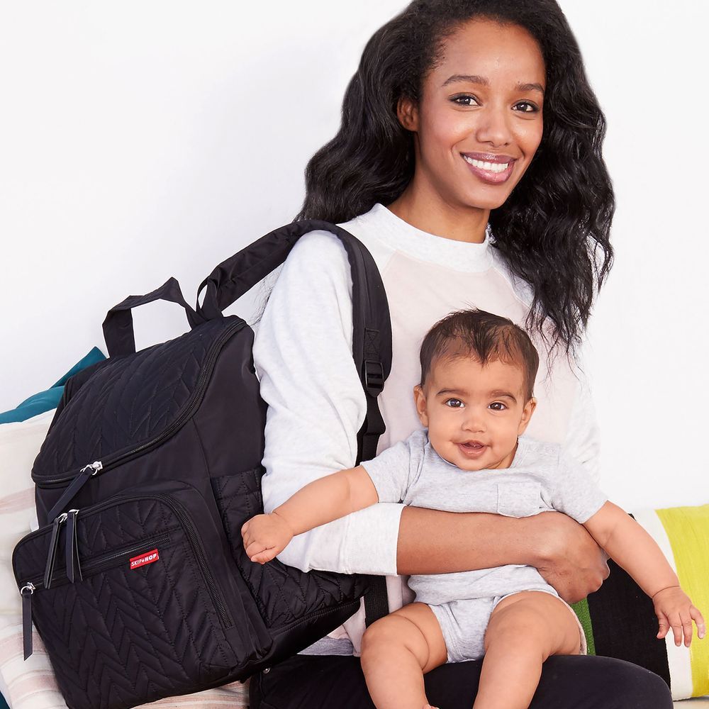 The Skip Hop Forma Diaper Backpack is a lightweight, quilted backpack designed for hands-free convenience. It features a spacious interior with an extra-wide opening, making it easy to find essentials quickly. The front compartment includes two multi-purpose packing cubes—one insulated for bottles and one mesh for clothing or snacks.