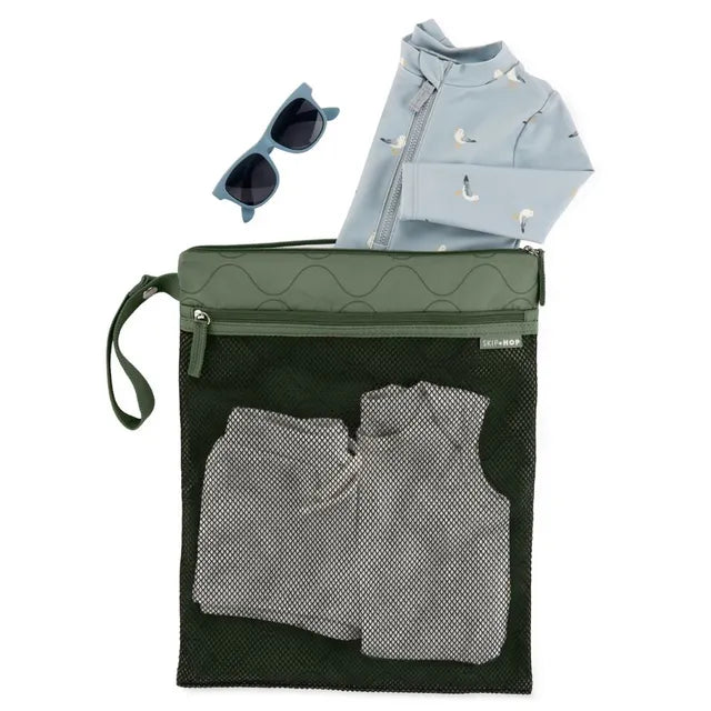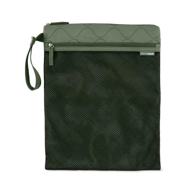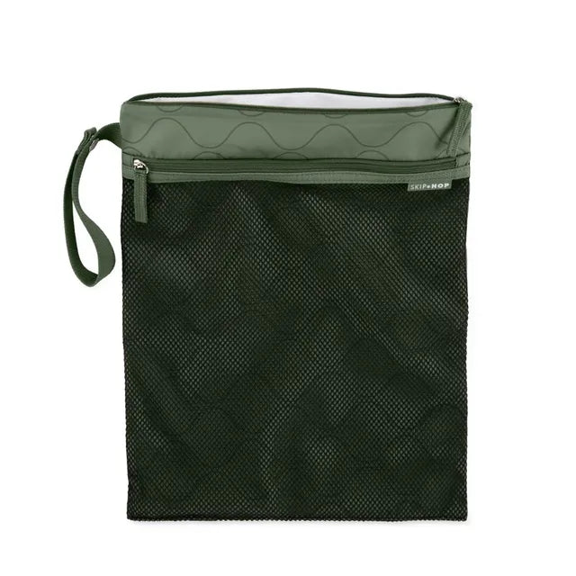 Stay organized with the SkipHop Grab & Go Wet Dry Bag in dark sage. This practical bag features two separate compartments for wet and dry items, making it perfect for diapers, swimsuits, or clothes. The waterproof interior keeps messes contained, while the secure zipper closure ensures nothing spills out. Compact, stylish, and machine washable, it's an essential accessory for parents on the move.