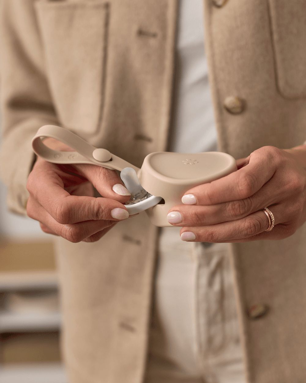 The Skip Hop Silicone Pacifier Holder is a soft yet sturdy accessory that keeps pacifiers clean and always accessible. Its modern, minimalist design is crafted from food-grade silicone in a stylish oat color—perfect for matching modern baby gear.