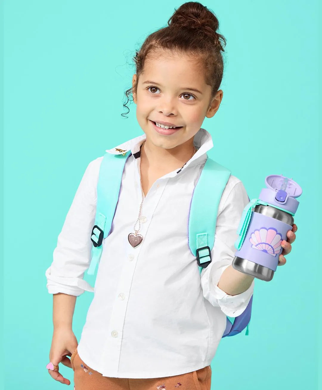 Fill their sipping with epic style! Featuring cool designs that let little personalities shine, this stainless steel water bottle helps keep drinks cool on-the-go. The pop-up lid keeps the flexible straw clean, while the non-slip silicone sleeve protects little hands from cold surfaces. Grab it by the strap & go!