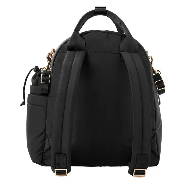 Chic diaper backpack and 5-piece accessory set.,Main compartment with zip closure.,9 pockets including two side bottle pockets and personal zip pocket.,Easily attaches to stroller with included stroller straps.